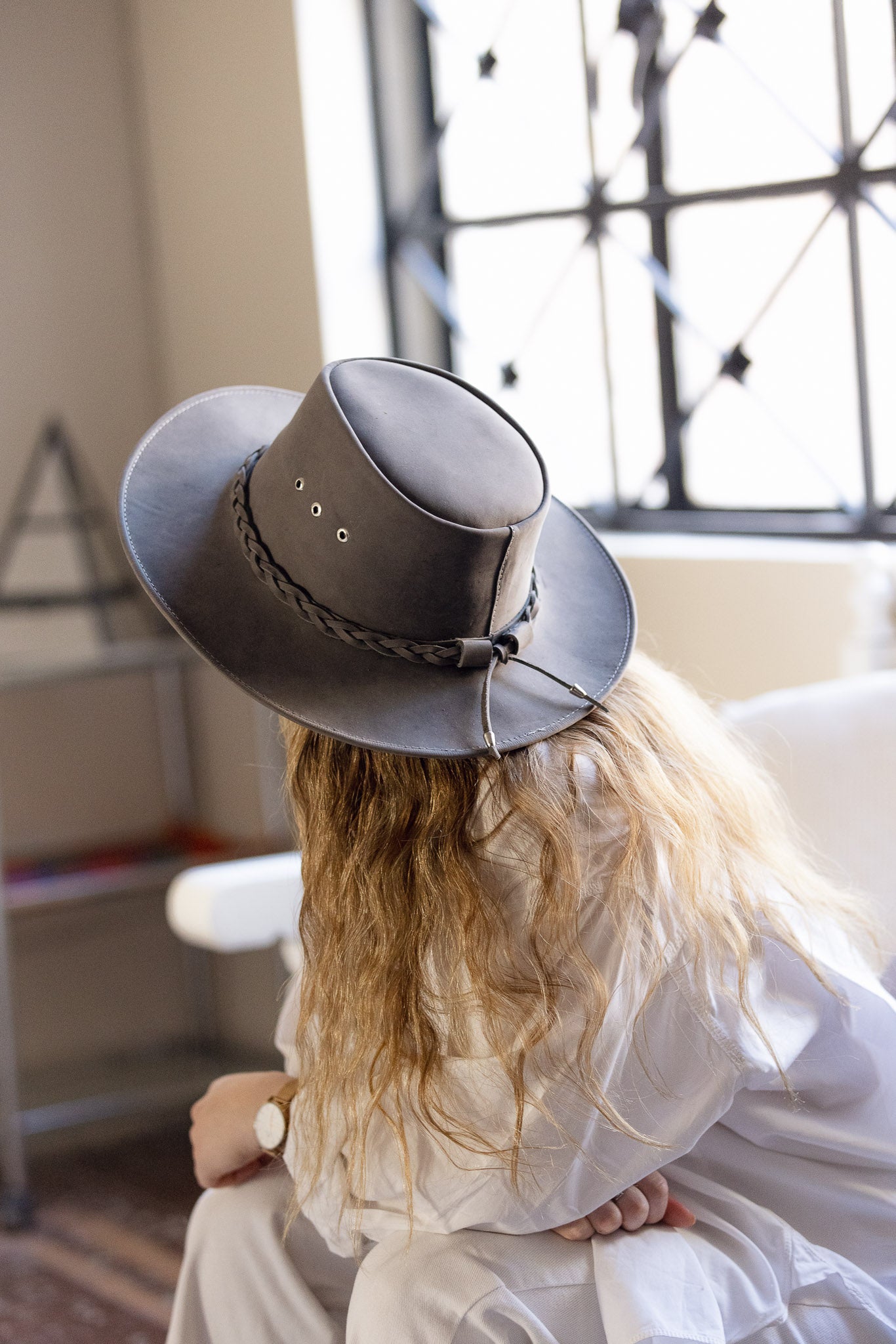 - Tira decorativa en trenza gris, con tira para ajustar a cabeza